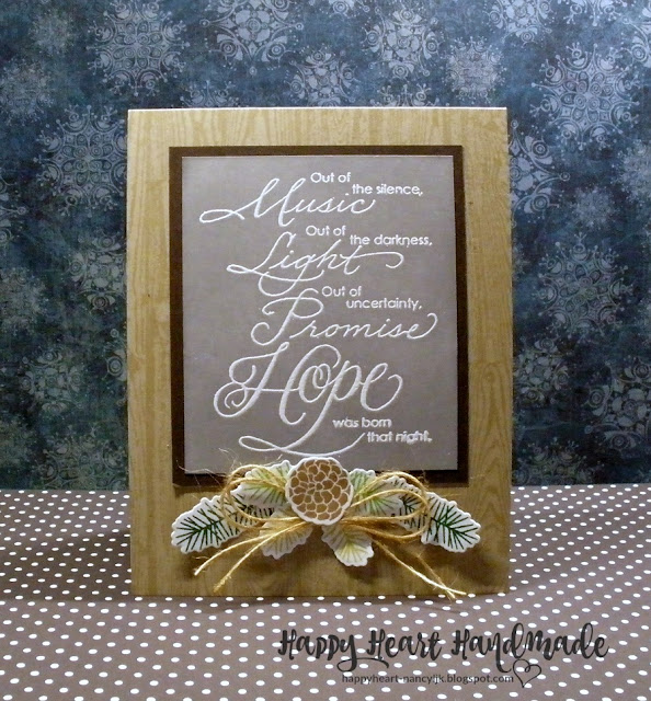 The wood background stamp is by MFT and the greens and pine cone are from Lawn Fawn's Deck the Halls set. For the main panel I white embossed the sentiment on white cardstock then blended on Hickory Smoke Distress Ink to get the chalkboard look.